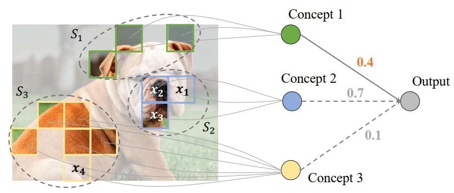 上述交互可以理解为一种“与关系”。当集合𝑆中每个输入单元都出现时,该交互被触发,同时对神经网络的输出产生一个额外的数值效用𝐼(𝑆)。相反,如果集合𝑆中任意一个输入单元被遮挡,则无法触发相应的交互,对网络输出的数值效用也随之消失。如下图所示,一个用于识别狗的图像的神经网络可能会建模“x1=狗脸颊”“x2=狗鼻子”和“x3=狗嘴”这三个图像区域之间形成的交互S2={x1,x2,x3}。只有当这三个图像区域全部出现时,该交互才被触发,并对神经网络输出产生一定的数值效用I(S2)=0.7。如果任意一个图像区域被遮挡,比如图中“狗脸颊”这一区域被遮挡,那么该交互就不被触发。