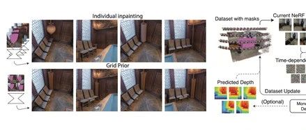 使用独立的2D补全模型进行多视角图像的补全存在一致性问题,因此NeRFiller提出了网格先验和联合多视角补全两种策略,来提高一致性。