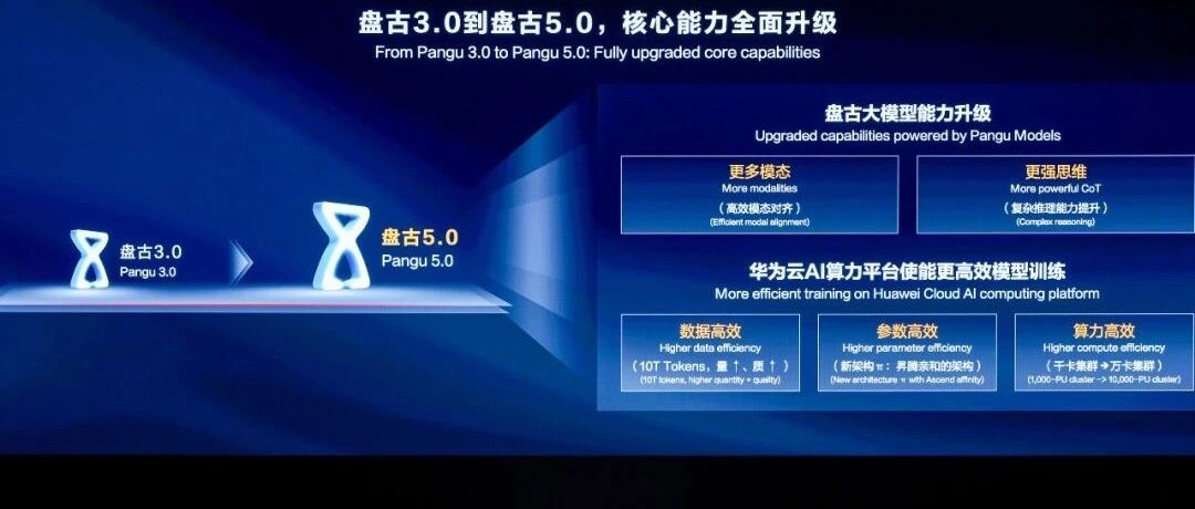 盘古大模型也是基于华为云的AI平台开发。会上,华为诺亚方舟实验室主任姚骏从数据高效、参数高效和算力高效三个方面介绍了盘古大模型5.0的训练过程。