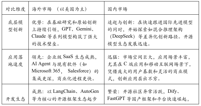 总体来看,海外市场在底层技术创新和成熟的企业软件生态方面具有先发优势,而国内市场则凭借庞大的应用场景、活跃的开发者社区和强有力的政策支持,在应用创新和产业落地方面展现出强大的活力和追赶势头。尤其是在算力自主可控和应用场景驱动这两个方面,中国正走出一条独具特色的发展道路。